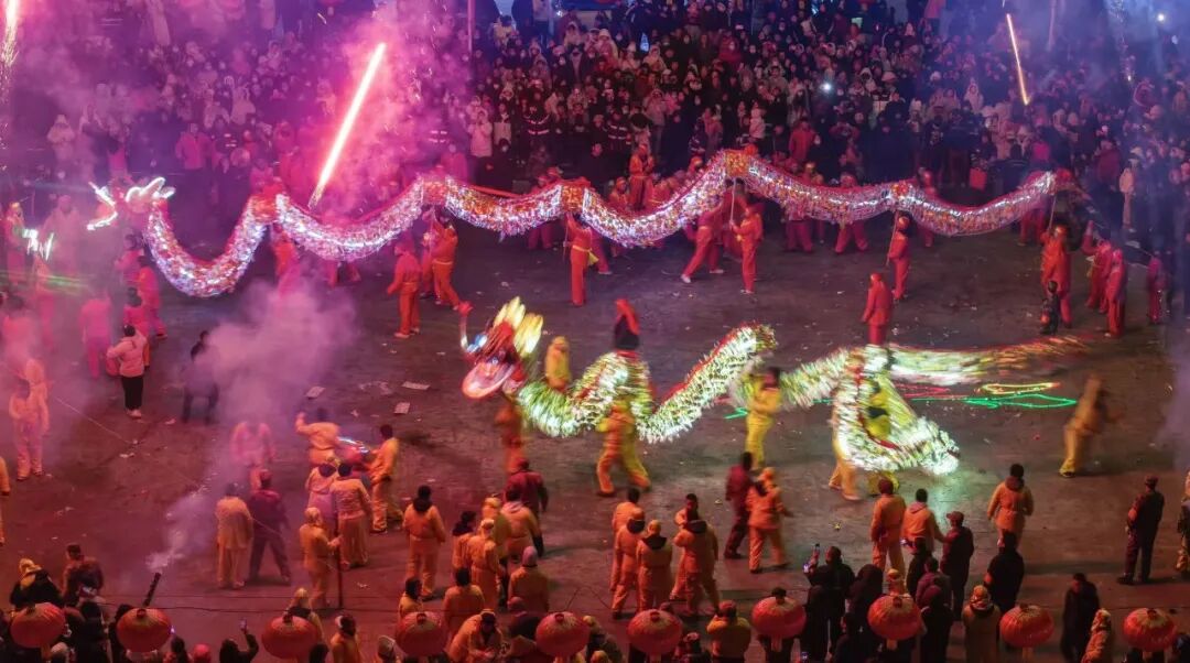非遗传承人30+道工序纯手工打造,专业鼓乐队现场伴奏,22 米长雌雄双龙舞动,随鼓点腾挪翻转,宛如真龙降世!