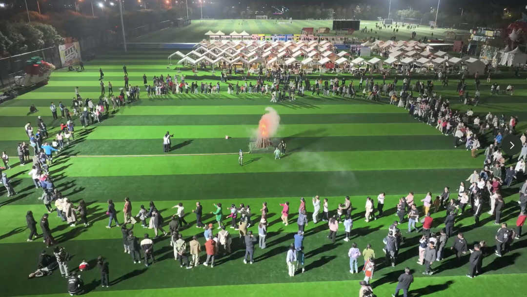 等天色渐暗,「世景生活草坪区」就成了欢乐主场!18点45分,跟着阿诗玛和机器人一起围绕“篝火”跳起欢快的舞蹈,不管会不会跳,跟着节奏,手拉手转起来都超解压,现场热闹到不想走~