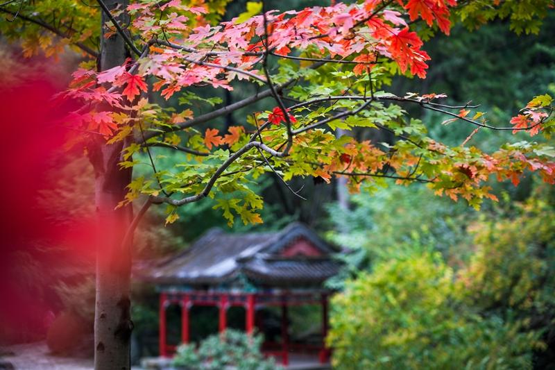 今年红叶节期间,公园再度推出广受欢迎的“赏叶地图”,精选全山18处彩叶观赏点位,以图文并茂的形式一一标注,为市民游客提供更丰富的秋游选择。这些观赏点与三条主题路线相互呼应,贯穿遍布香山南北各游览路线,覆盖高、中、低不同海拔区域,最佳观赏时间也各不相同。“枫林村”是无需跋涉的秋日私藏,渐红的枫叶与金黄的银杏在此交织,营造出静谧而浓郁的秋日氛围;而在“看云起”登亭远眺,则有豁然开朗之感,云霞、古寺与漫山彩林共同演绎出香山秋日的磅礴诗意。其中包括碧云寺、山杏林等经典“打卡地”,也新增了静翠湖“湖山相映”的自然景观,满足不同游客的赏景偏好。在点位选择上,公园特别注重彩叶树种多样性以及与景观建筑的融合效果。18处点位中有10处位于建筑周边,游客既可置身景中,感受人文与自然的和谐交融,也可远眺借景,欣赏层次丰富的秋日画卷。