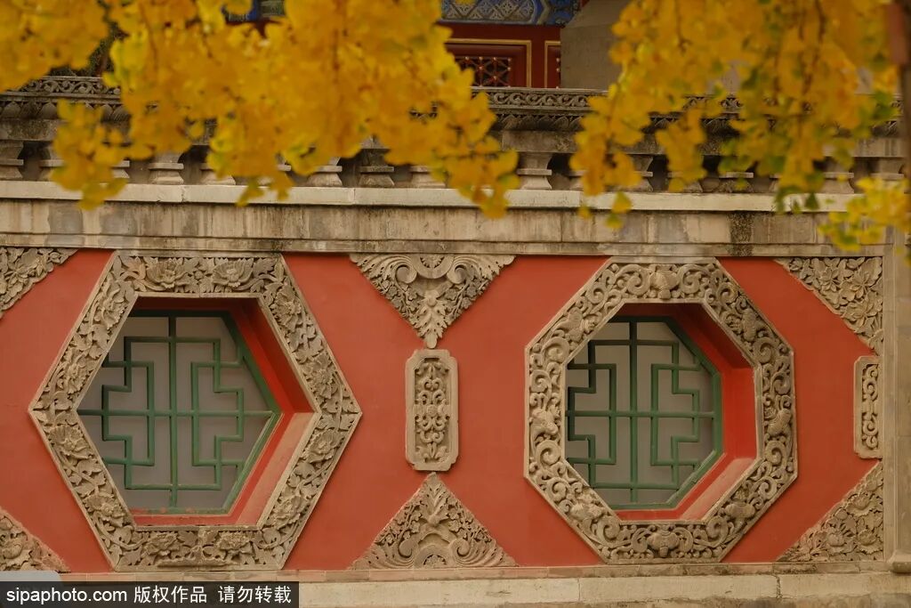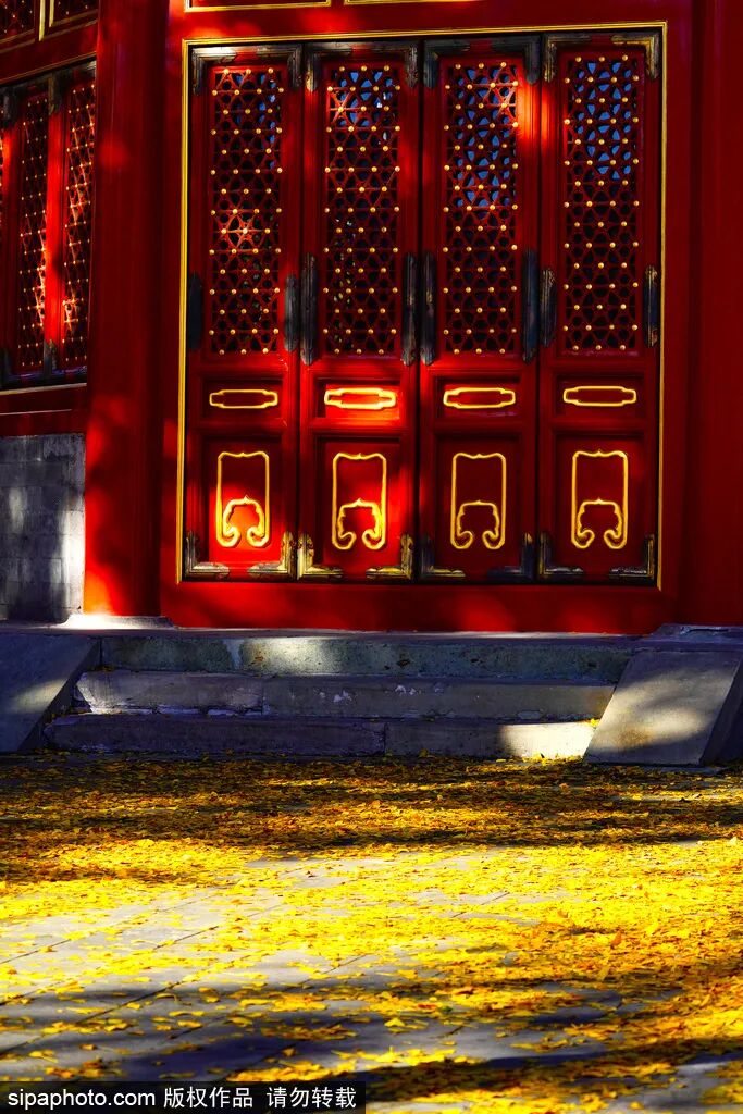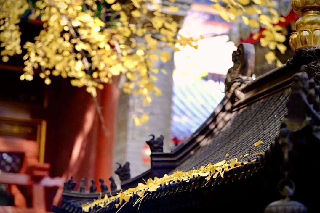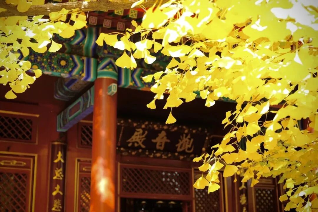 红墙飞檐间,一片片金色树叶随风舞动着,仿佛在向人们诉说着这里的故事,又或者,是想分享这秋日的盛景,表达此时此刻的美好心情。