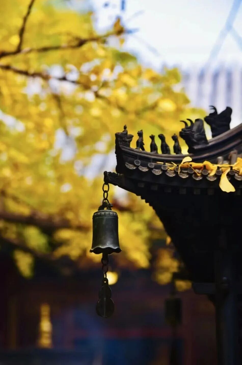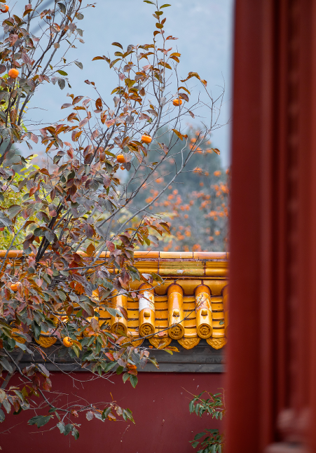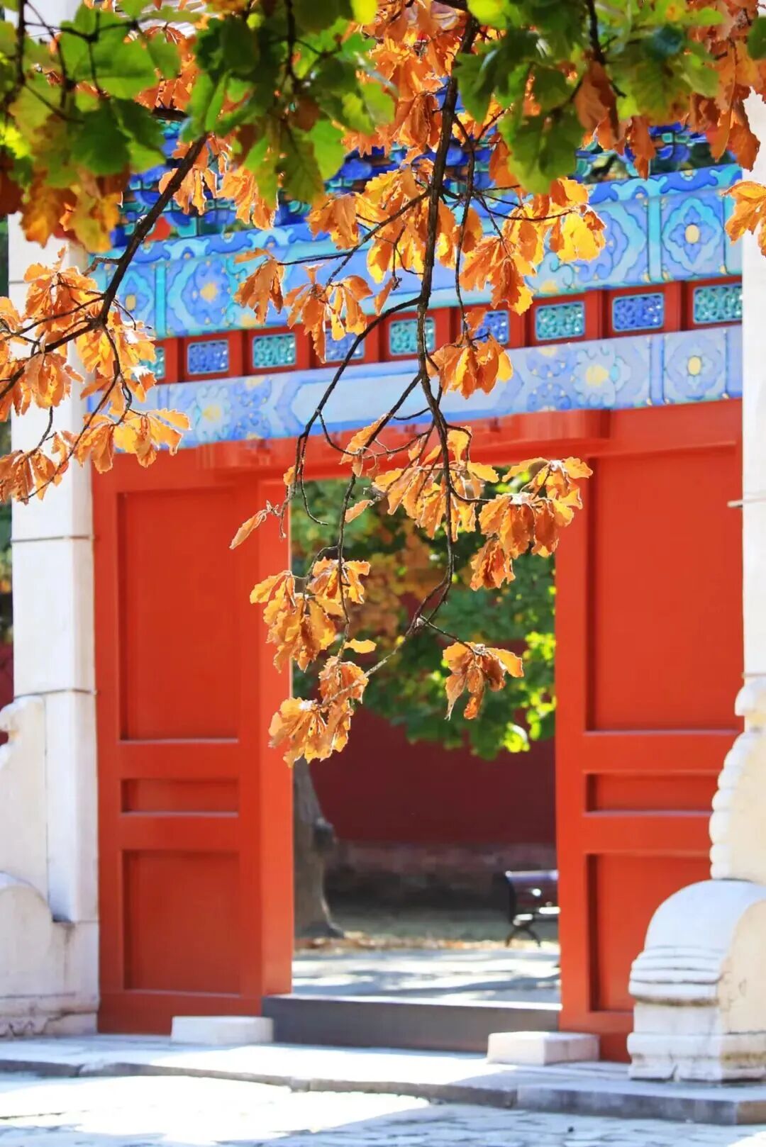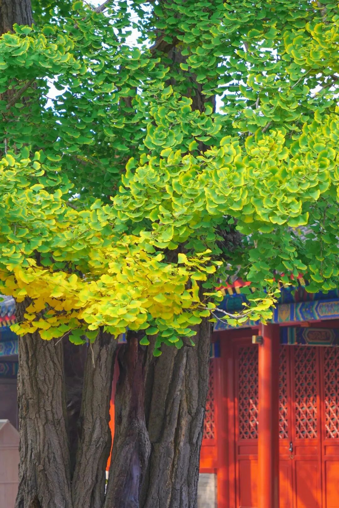 红墙飞檐间,一片片金色树叶随风舞动着,仿佛在向人们诉说着这里的故事,又或者,是想分享这秋日的盛景,表达此时此刻的美好心情。