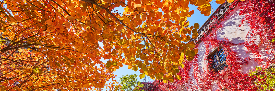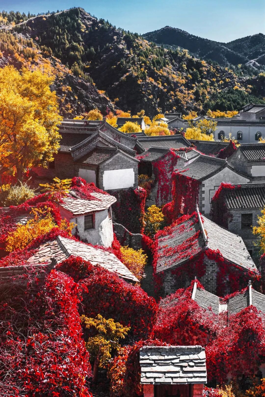 当五叶地锦染红墙壁与屋檐,当秋叶在暖阳下散发出迷人的光彩,古北水镇此时又成为了长城下的“红叶小城”。