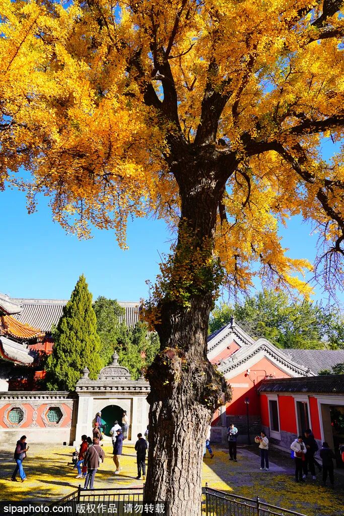 而八大处公园的银杏树主要分布在寺庙内,黄叶纷落时,满地铺满了碎金,当黄叶染秋,与古建交相辉映,构筑起岁月沉淀后的别样美丽。