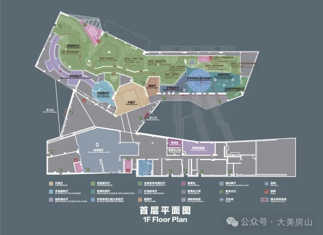 设有开篇厅、宇宙奥秘厅、地史演化厅、资源展示厅、地质科普厅、世界地质公园大家庭厅、生物多样性展示厅、矿物标本厅、展望厅九大展厅,室外科普广场展示大型标本和部分地学名人雕像。