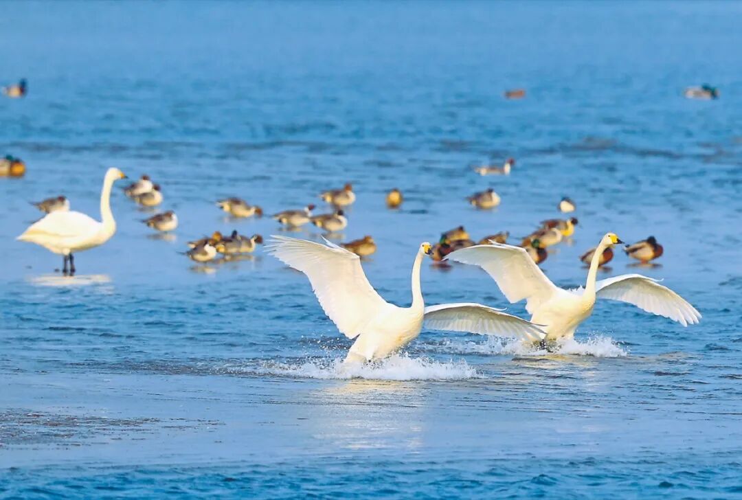 大批迁徙鸟类,万鸟齐飞的场面,冬日限定“奇观”,每日都在这片水域上演,是冬季观鸟拍鸟的绝佳去处。