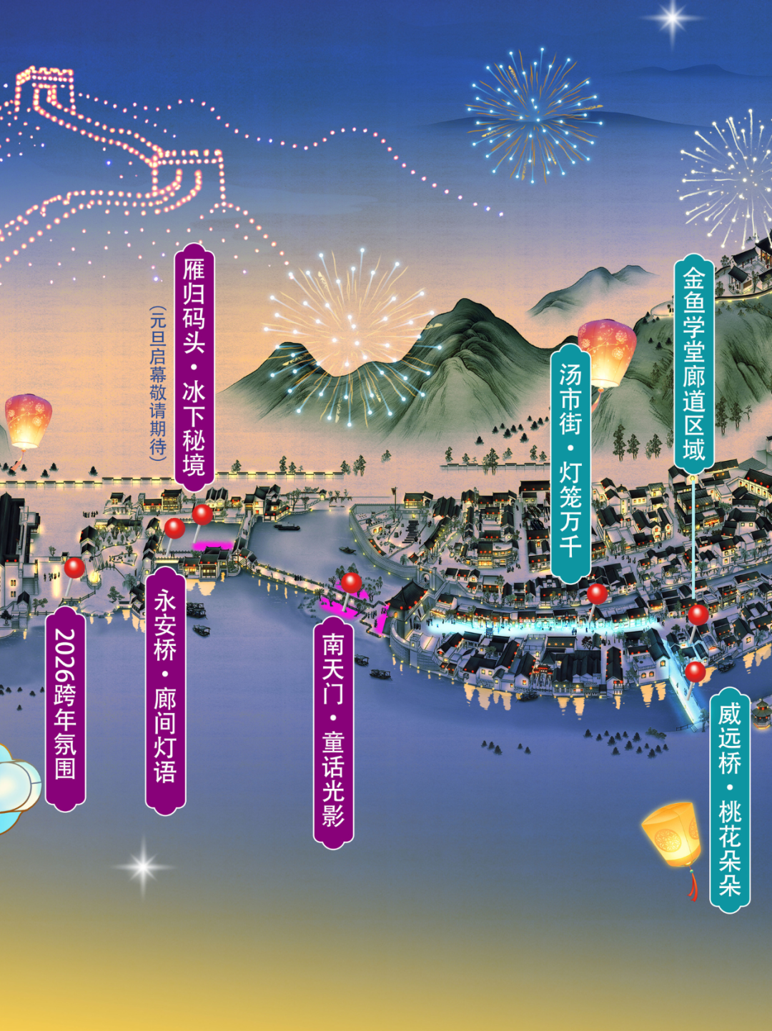 已开放:吉灯贺岁——南天门童话光影,氛围感拉;水街风华——灯笼万千超出片、金鱼学堂廊道灯影摇曳