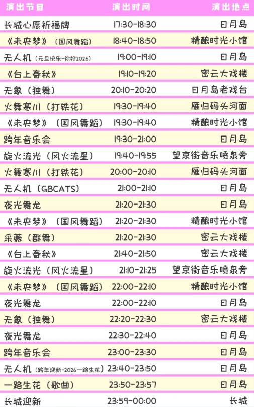 长城时间仪式:12月31日登长城看日落告别旧岁,领祈福牌、享长城茶歇、参与舞龙互动,2026年1月1日迎长城日出迎新,让第一缕阳光见证新的开始,日月岛广场还能手写心愿、放飞孔明灯,让长城见证你的心愿。