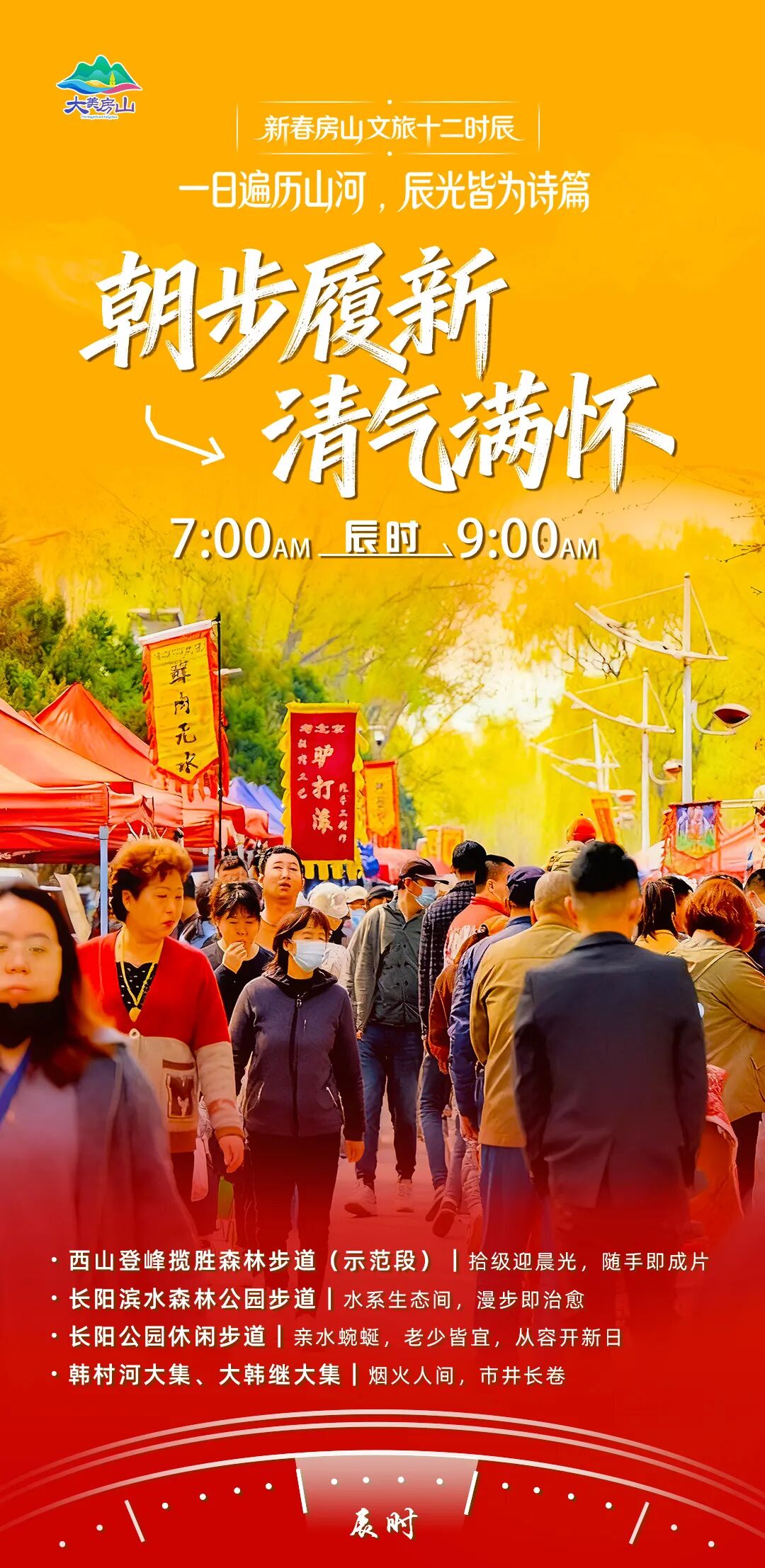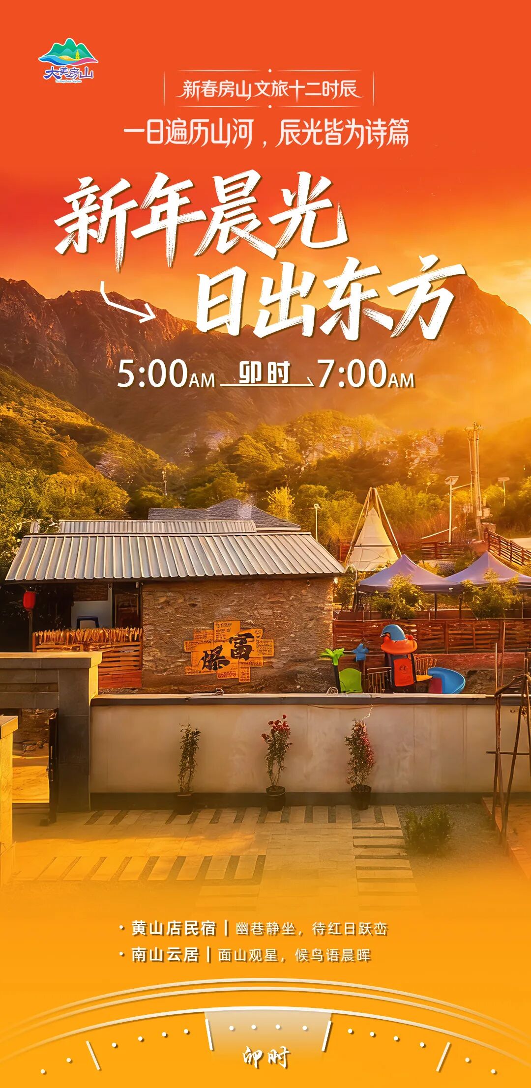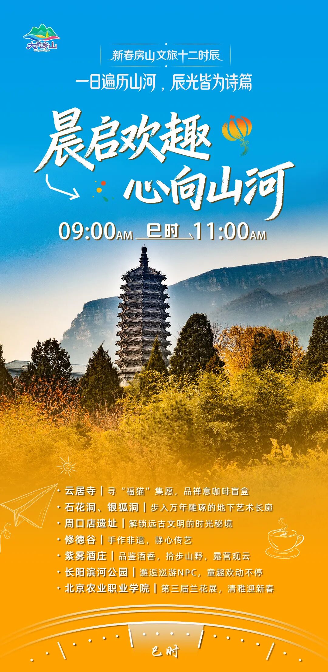 《新春房山文旅十二时辰》打破传统景点单一罗列的模式,以“巳时”至“辰时”十二时段为叙事脉络,为每个时辰精心匹配相应场景与活动,引领游客在时光流转中深度感受房山的文旅韵味。