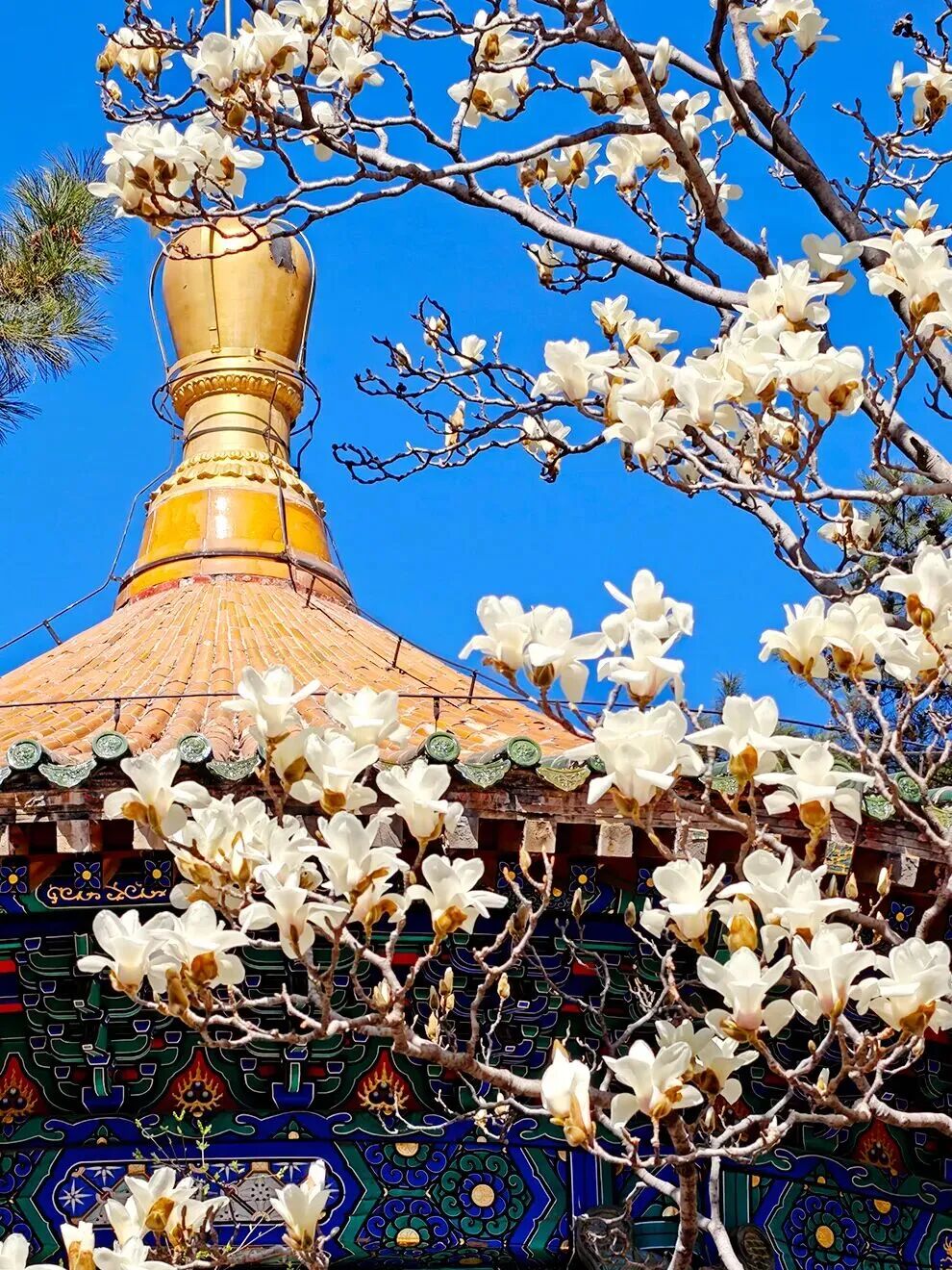 3月末,当春风吹过京西山峦,潭柘寺的“二乔玉兰”将悄然绽放。粉白双色的花瓣在春风中轻舞,这座古老的寺庙,将被春意轻轻唤醒。
