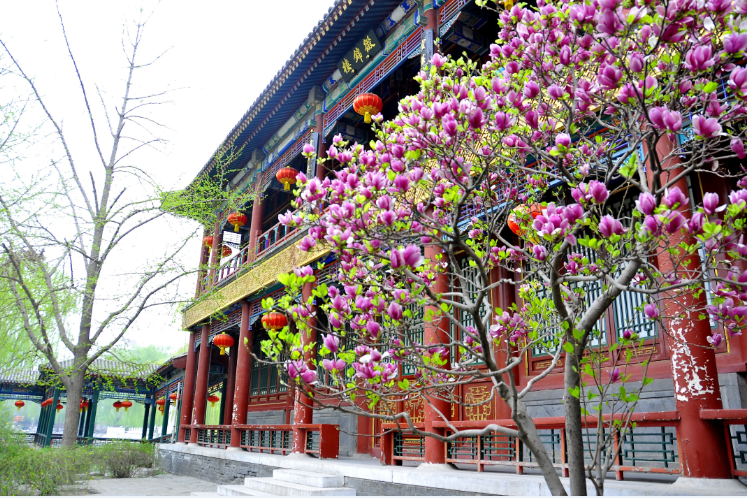 预计四月上旬,位于紫菱洲缀锦楼前的紫玉兰将绽放。“霓裳片片晚妆新,束素亭亭玉殿春”,薄如蝉翼的花瓣宛如紫色的云彩,姿容娇美,绚丽夺目。