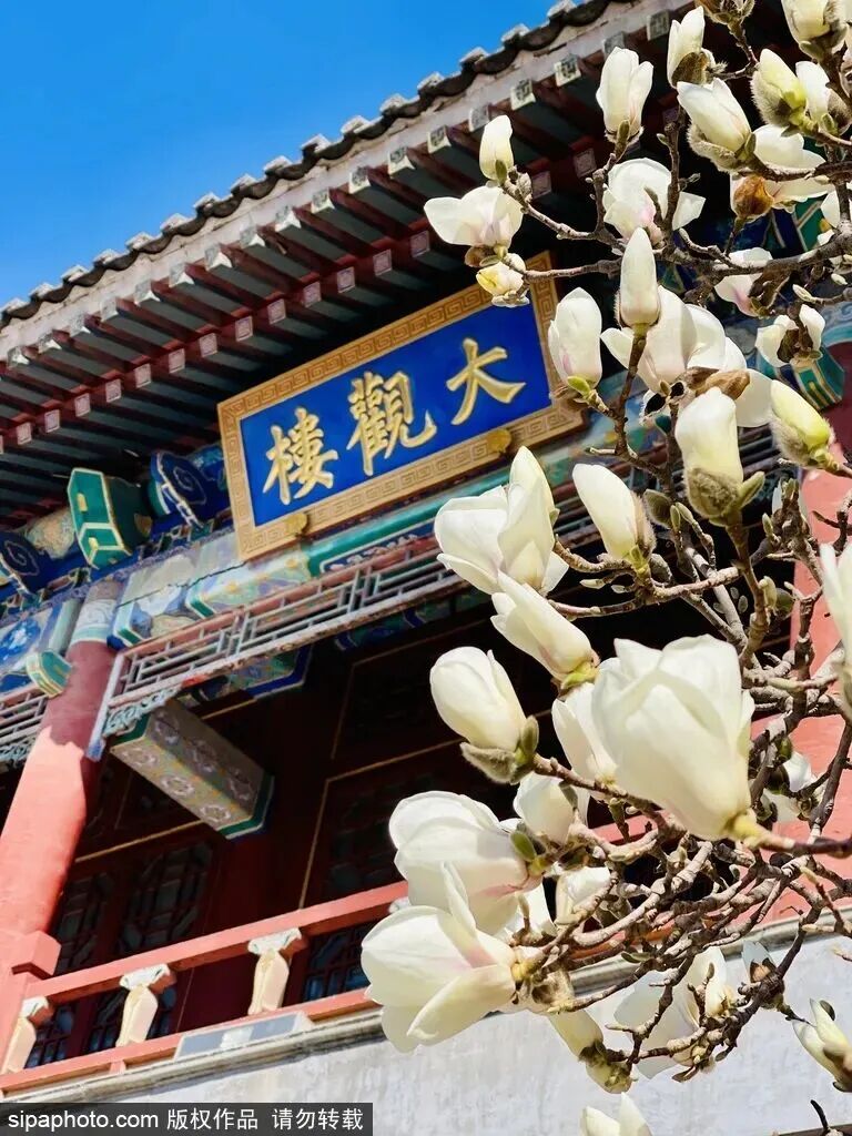 目前,大观园内已有两株玉兰开花了,花朵亭亭玉立,花瓣莹洁清丽,映衬着大观楼的二层中式建筑,3月中下旬迎来最佳观赏期。