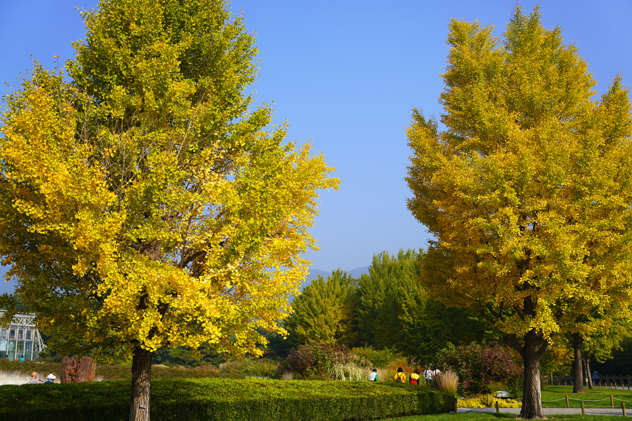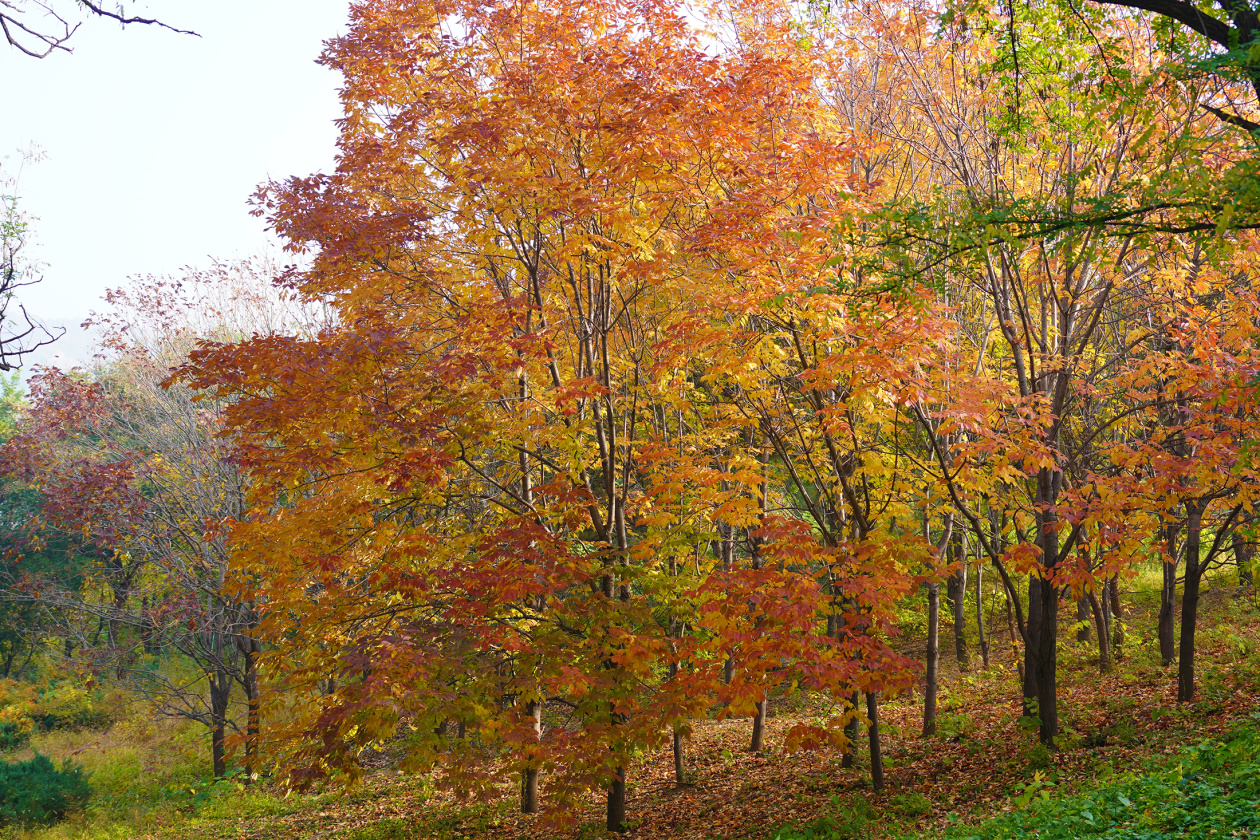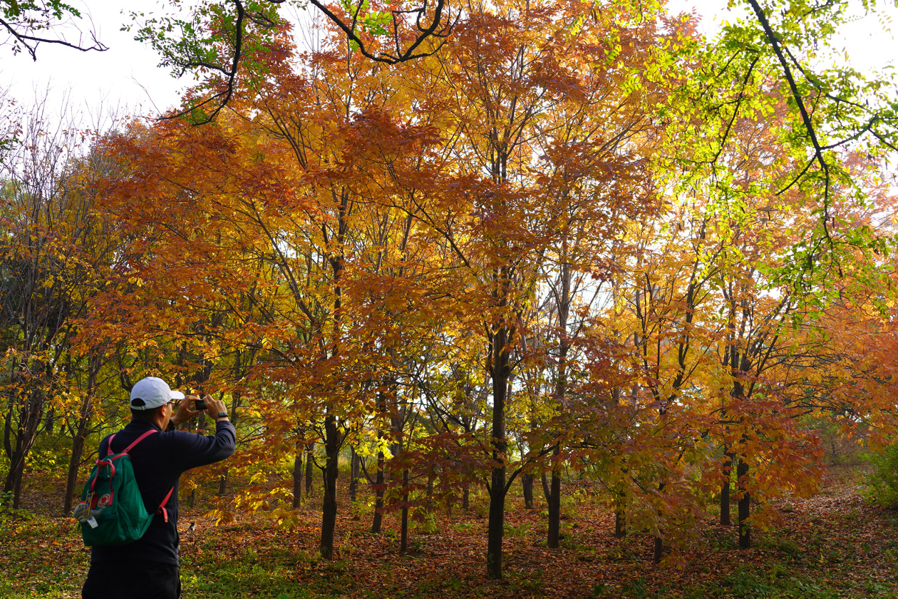 国家植物园是北京地区赏秋的理想场所,这里不仅山清水秀,彩叶植物的种类也特别多,目前能观赏到的彩叶植物有近百种。很多彩叶植物都是国家植物园近年来引进的新优植物品种。在国家植物园(北园)一片靓丽的秋色映入眼帘,红的像火、黄的似金、紫的如墨。‘秋火’、‘秋欢’、‘秋紫’三个白蜡的新品种在园区进行了集中展示。白蜡是北京地区的乡土植物,传统的白蜡大多数叶片到秋季会变为黄色,而这三个品种的白蜡的叶片会变为深红、浅红、紫红的颜色,使得白蜡在秋季的色彩更加丰富。除了白蜡,火焰卫矛、金叶梣叶槭、绿瓶榉等都是国家植物园近年来引进的优良彩叶植物。