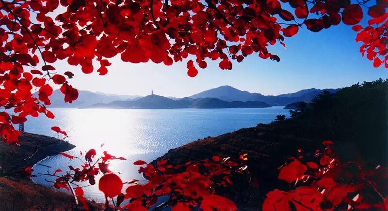 万亩彩叶与波光粼粼的金海湖景相互映衬