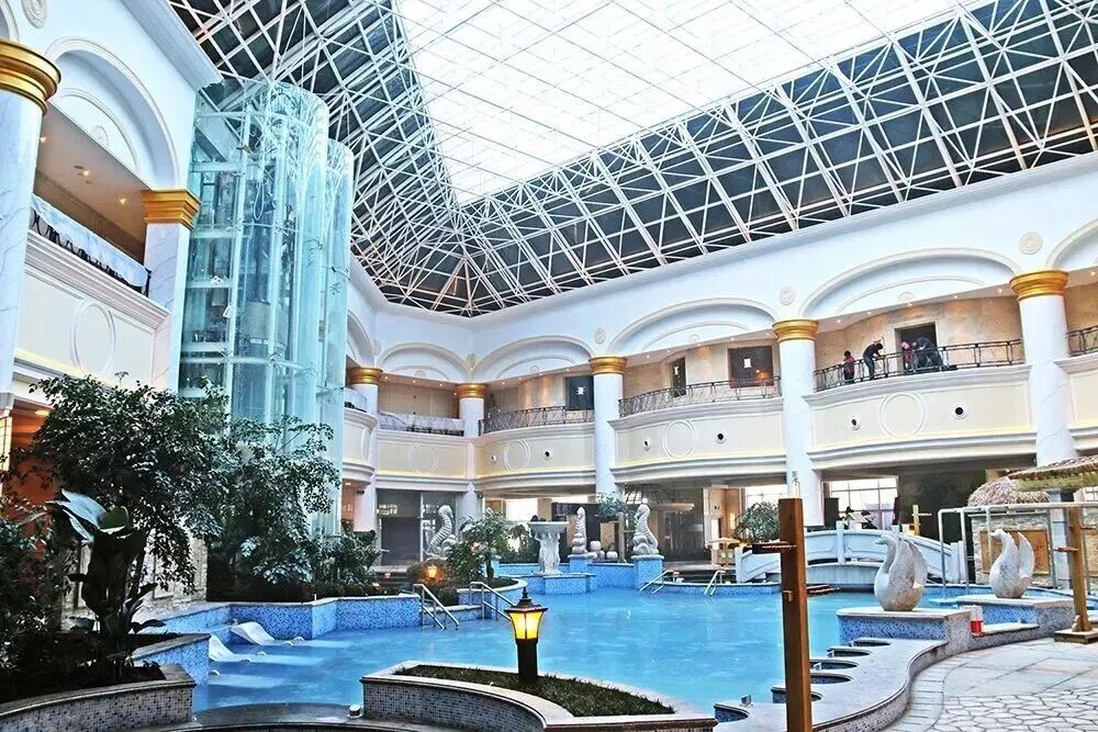 室内如热带雨林般葱郁,牛奶浴、玫瑰浴等12种功能池任选,室外8个中式泡池依田园而建泡汤时抬头可见蓝天白云与小桥流水。