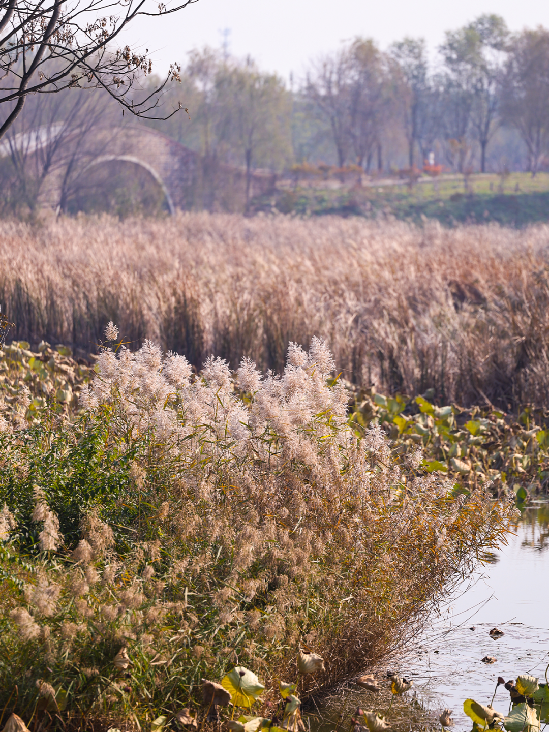 11月上旬岸边芦苇将达到最佳观赏期,秋日阳光透过薄雾,洒在银灰与浅金交错的芦苇丛中,湖面随风荡起细碎涟漪,倒映出芦苇的柔影与远处古建筑的轮廓,仿佛置身一幅淡雅的水墨画中,宁静而悠远。