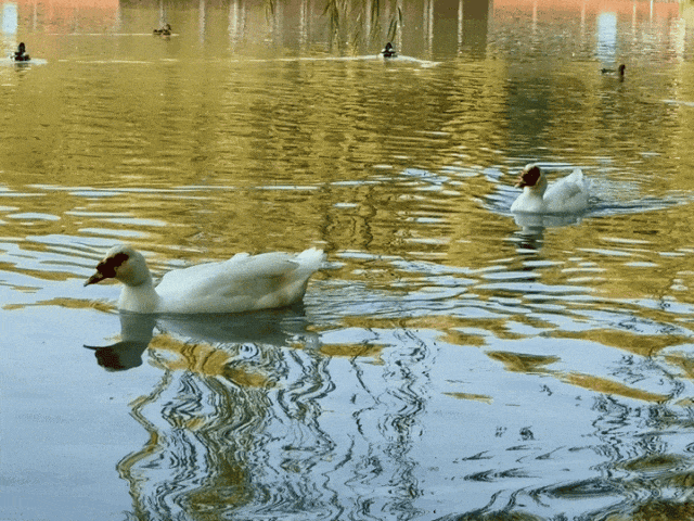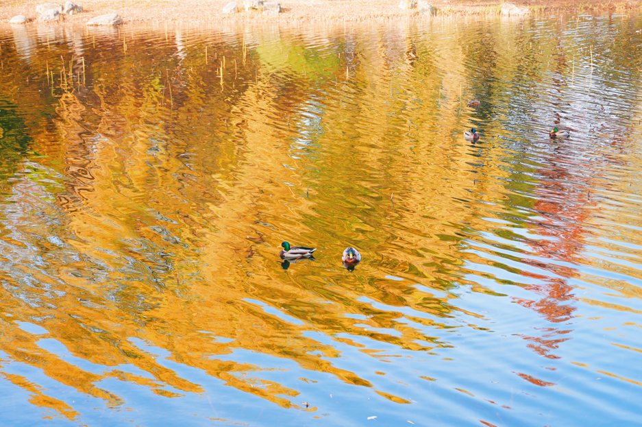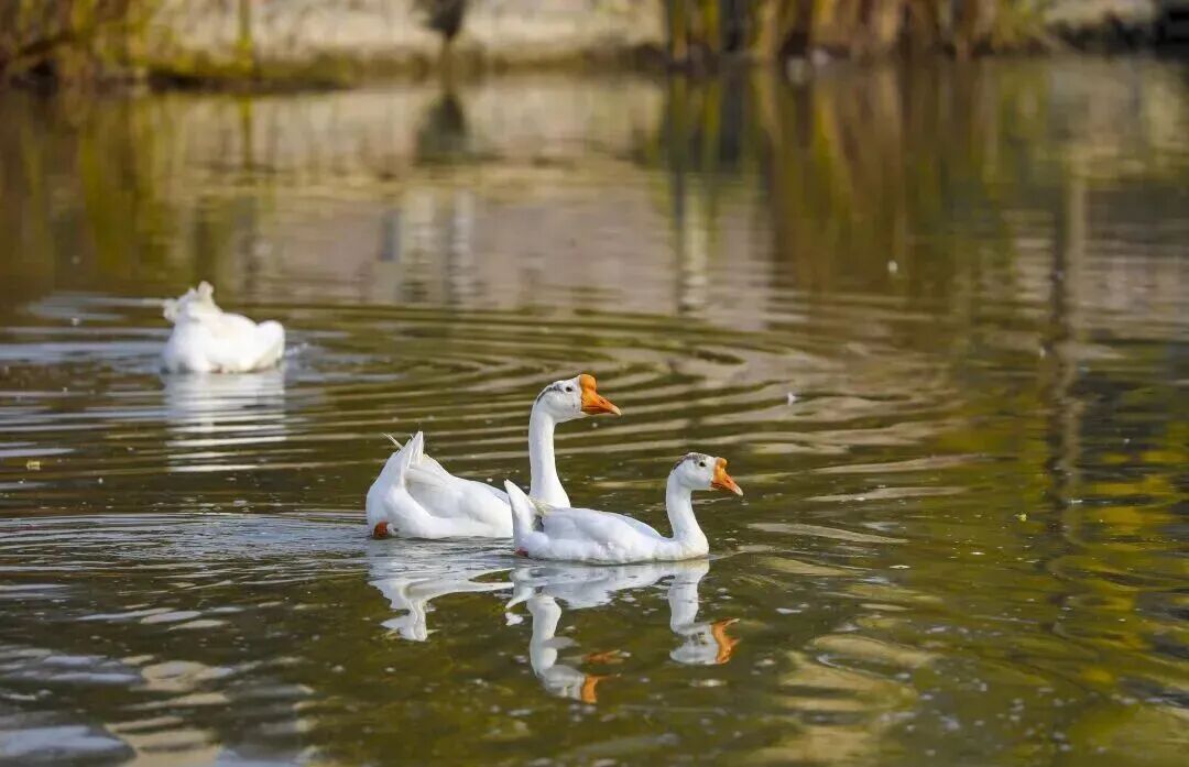 一池碧蓝的湖水,水边金黄色的芦苇草随风轻轻摇曳,馋嘴的小鸭难以抗拒游人投下的美食诱惑,飞速地冲过来一口吞下,一摆尾巴又消失在大家眼前为水面上增添了一圈圈美丽的波纹。