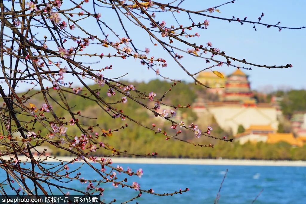 点点金黄色的花朵,掩映在绿叶中,俏皮可爱,这波“反季节”操作,直接把冬日浪漫氛围拉满!颐和园会“反季节”操作的还有西堤的山桃花!这株“认错季节”的山桃花位于镜桥和连桥之间,粉白配黄叶,美不胜收。