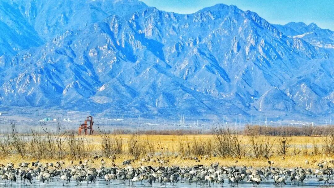北京进入候鸟秋冬迁徙高峰,大批灰鹤与野鸭等陆续抵达,位于延庆区的北京野鸭湖国际重要湿地,形成千鹤竞翔、万鸟齐舞的和谐自然景观。
