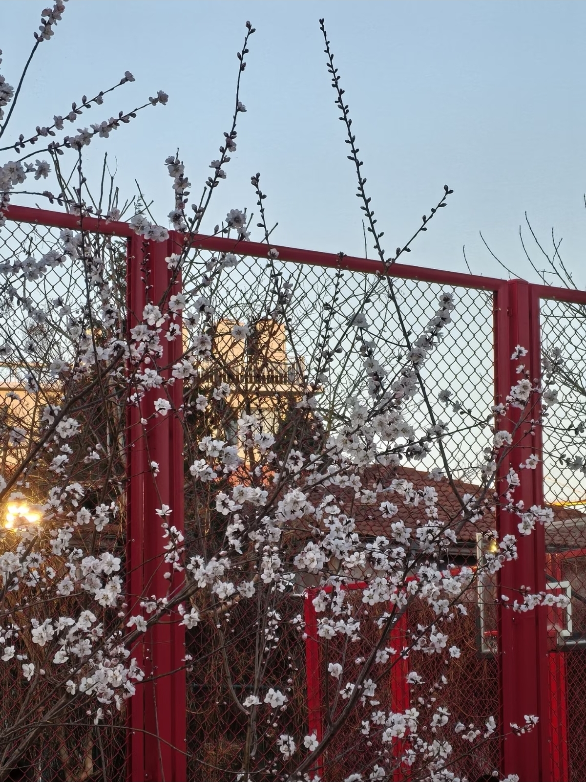 亮点:桃花与现代建筑相映,傍晚时分夕阳斜照,花瓣泛着暖光,氛围感十足。