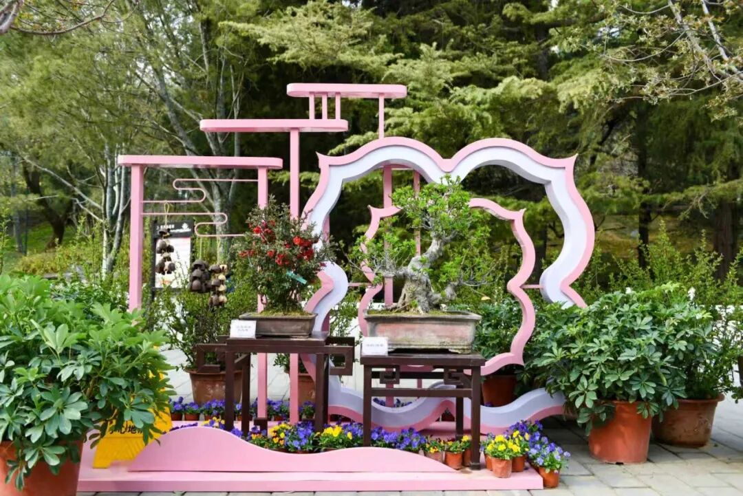 值得一提的是,在中心广场的精品盆栽区,公园精心布置了“诗、酒、花、茶”4个主题展棚,以博古架的形式展出500余盆精品海棠盆景,让游客市民近距离感受海棠盆景的精巧雅致;其中云龙海棠形似游龙,枝条苍劲、蜿蜒灵动;长寿冠海棠组成的山水造型盆景大气磅礴,尽显匠心雕琢之美。