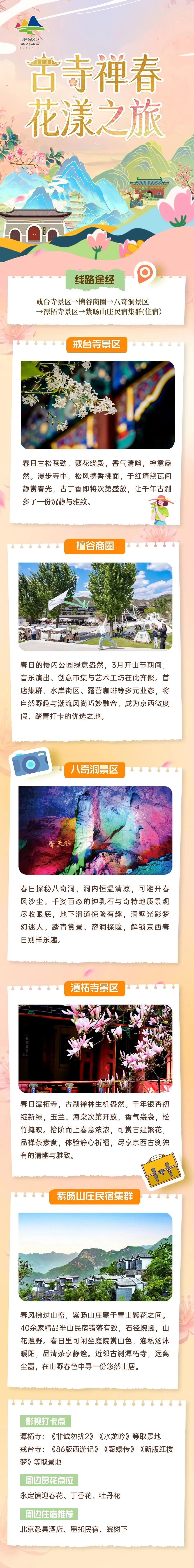 从古寺禅香到古道风华,从古村乡愁到山野春色,这条整合线路将京西春日的多样与美好尽数收录,愿你带着古寺的沉静,古道的历史、古村的暖意离去,把京西春日独有的禅韵、风华与温柔,深深珍藏在记忆里。